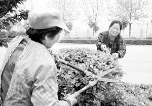 昨日,興旺路上兩名花工正在修剪道路隔離帶內的花木。春暖花開正是修葺花木的最佳時機,市園林部門組織人員對市區綠化植物進行適時修整,確保環境整潔有序。 (記者 沈湛 攝)