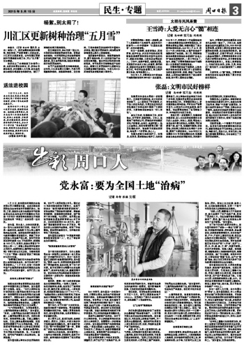“近年來土壤酸化板結(jié)速度加快,所有土地遭受不同程度的農(nóng)資次生災(zāi)害。建議各級(jí)黨委和政府及有關(guān)部門應(yīng)盡早重視土地污染治理工作,牽頭組織相關(guān)部門,爭取盡快在全市范圍內(nèi)宣傳、推廣和應(yīng)用土地污染治理技術(shù),逐步向全國受污染的土地開戰(zhàn),為子孫留下更多的凈土?!秉h永富說,這是他的夢想。