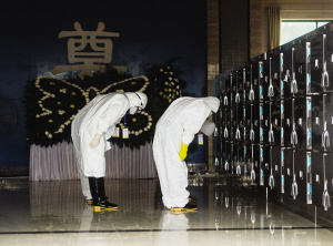 細心為逝者入殮 6月9日,在為遺體化妝前,入殮師在停靈間的冰柜前向逝者鞠躬。當日,在湖北省監利縣容城殯儀館,入殮師細心為遇難者入殮,辦理善后事宜。 新華社發