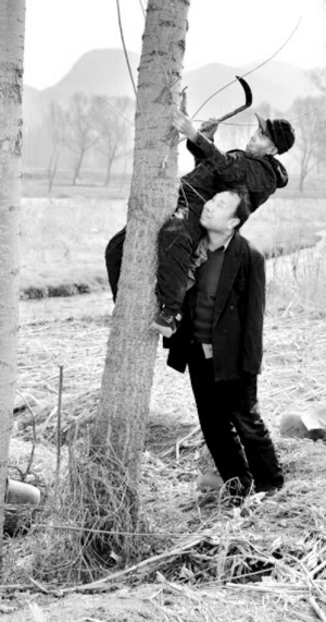 賈文其用肩膀將賈海霞頂起來,賈海霞用鐮刀將大樹多余的枝杈砍下來做樹苗。
