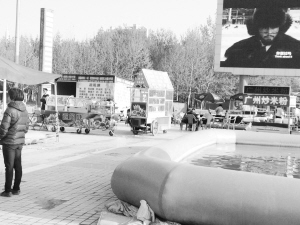 4月8日18時許,記者在現場看到,廣場的中央噴泉東側擺了許多攤點,有的攤點甚至把桌椅擺到了人行道上(如圖)。在廣場東側的出入口處,一些賣飯的商販已經將桌椅擺放整齊,不寬的道路被占去近一半。